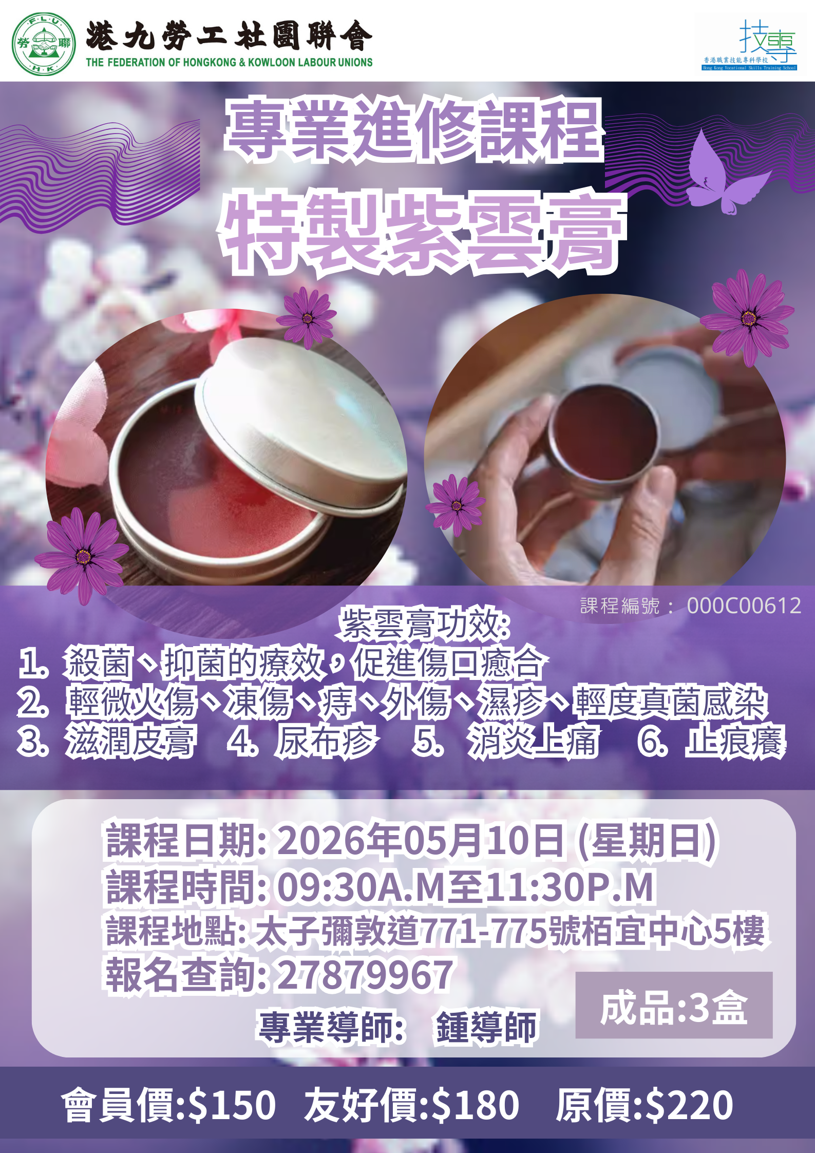 特製紫雲膏 課程日期:2026年5月10日 課程時間:09:30-11:30 費用: 會員價:150…