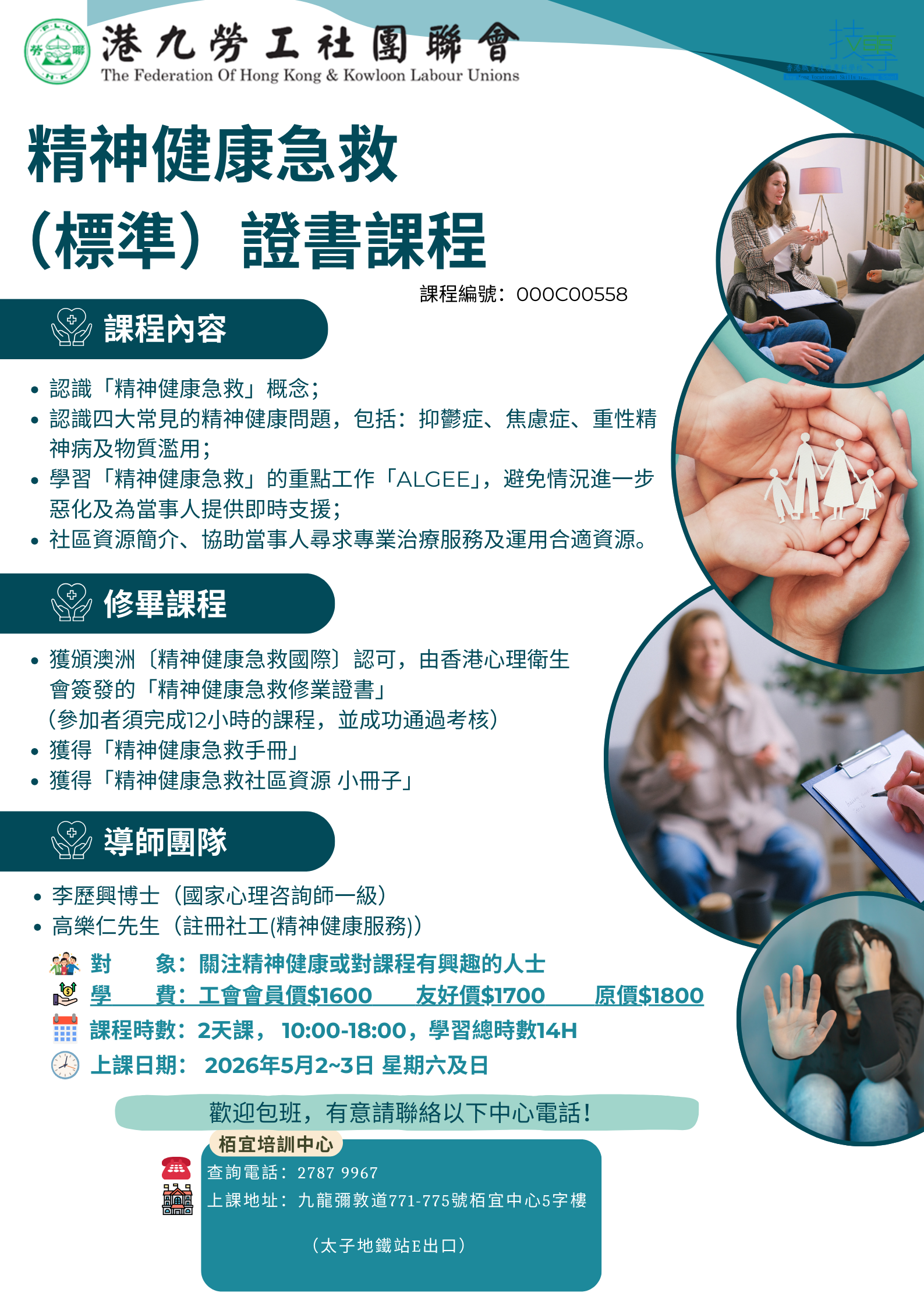 精神健康急救 (標準)證書課程 課程日期:2026年5月2日至5月3日 課程時間:10:00-18:…