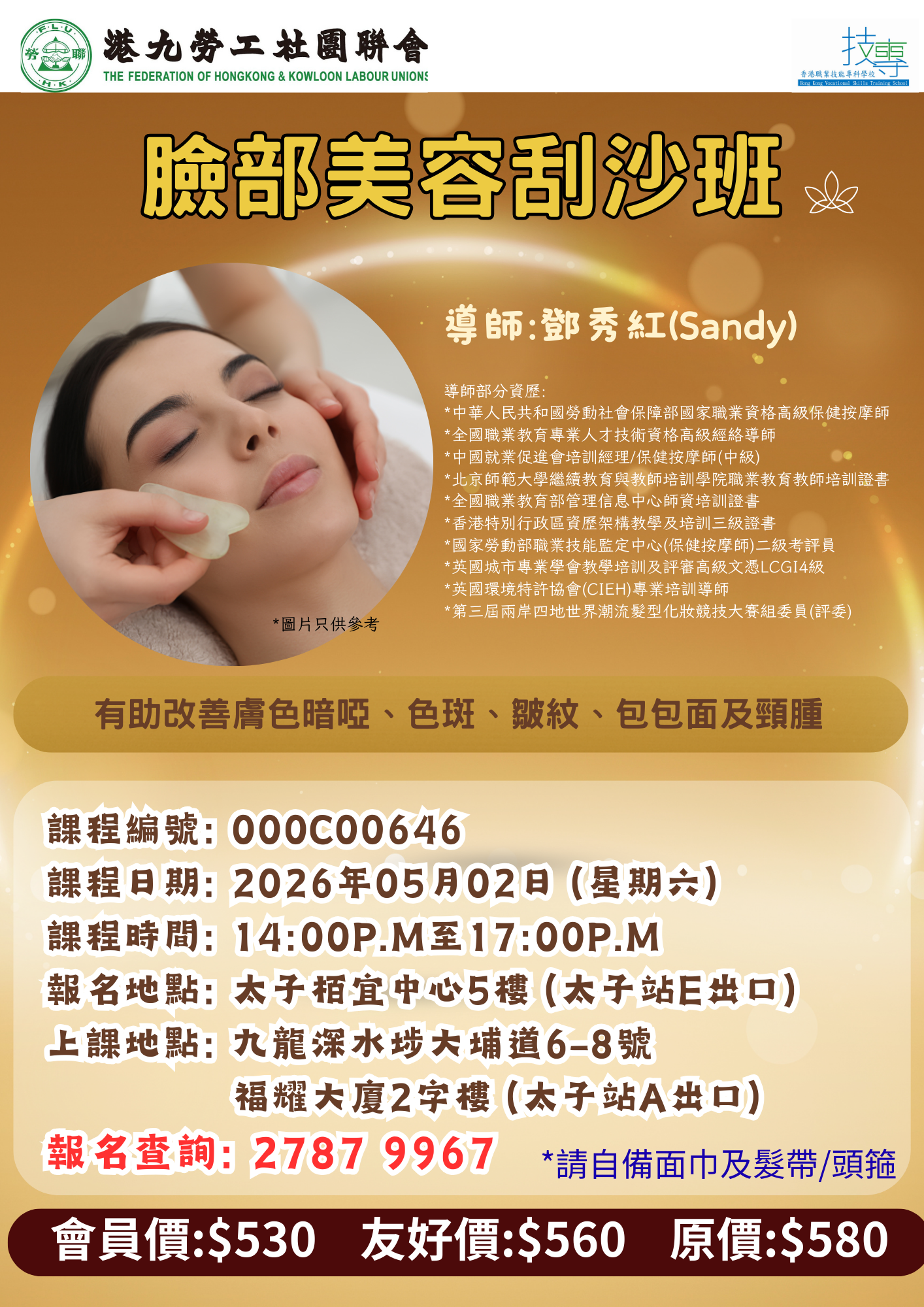 臉部美容刮沙班 課程日期:2026年5月2日 課程時間:14:00-17:00 費用: 會員價:53…