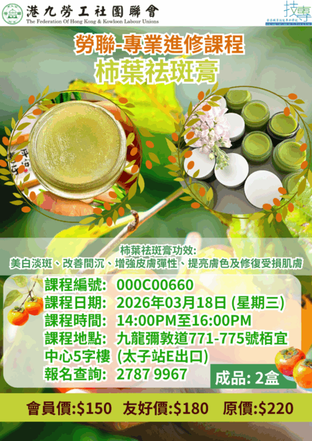 柿葉祛斑膏 課程日期:2026年3月18日 課程時間:14:00-16:00 費用: 會員價:150…