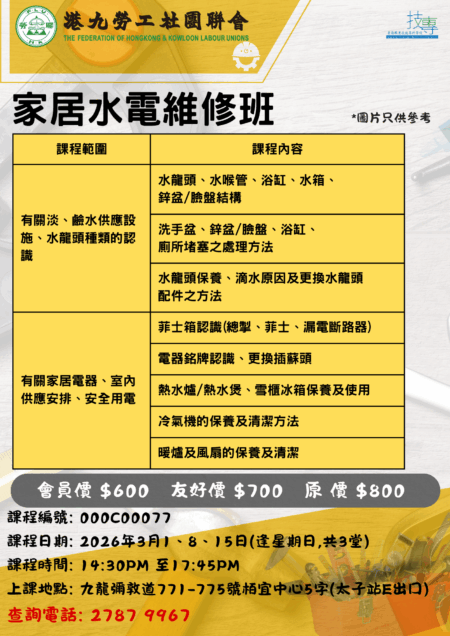 家居水電維修班 課程日期:2026年3月1,8,15日 課程時間:14:30-17:45 費用: 會…
