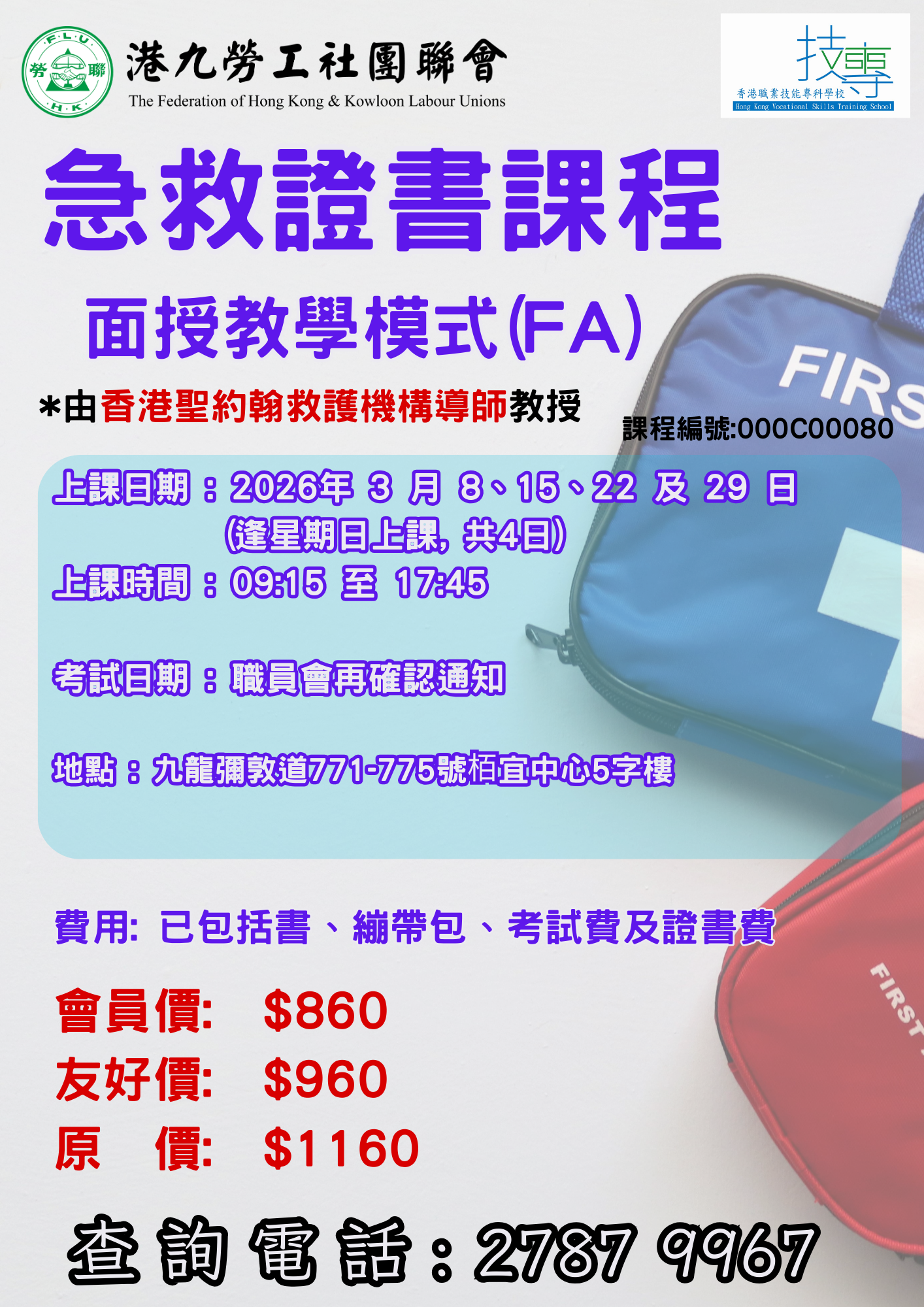急救證書課程 課程日期:2026年3月8,15,22,29日 課程時間:09:15-17:45 費用…