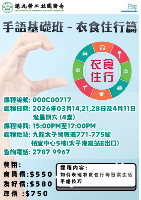 手語基礎班 – 衣食住行篇 課程日期:2026年3月14,21,28日,4月11日 課程…